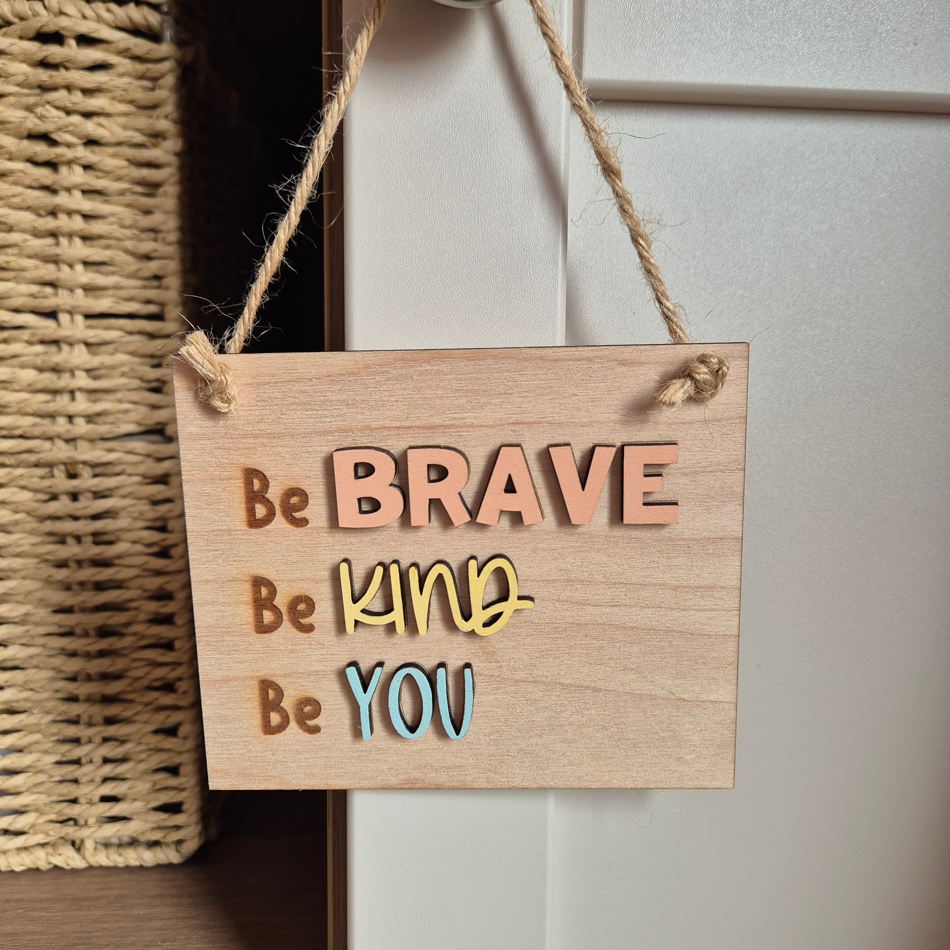 Bring a little charm, colour and personality to your child's room, play space or nursery with our handcrafted wooden hanging sign: "Be Brave. Be Kind. Be You".