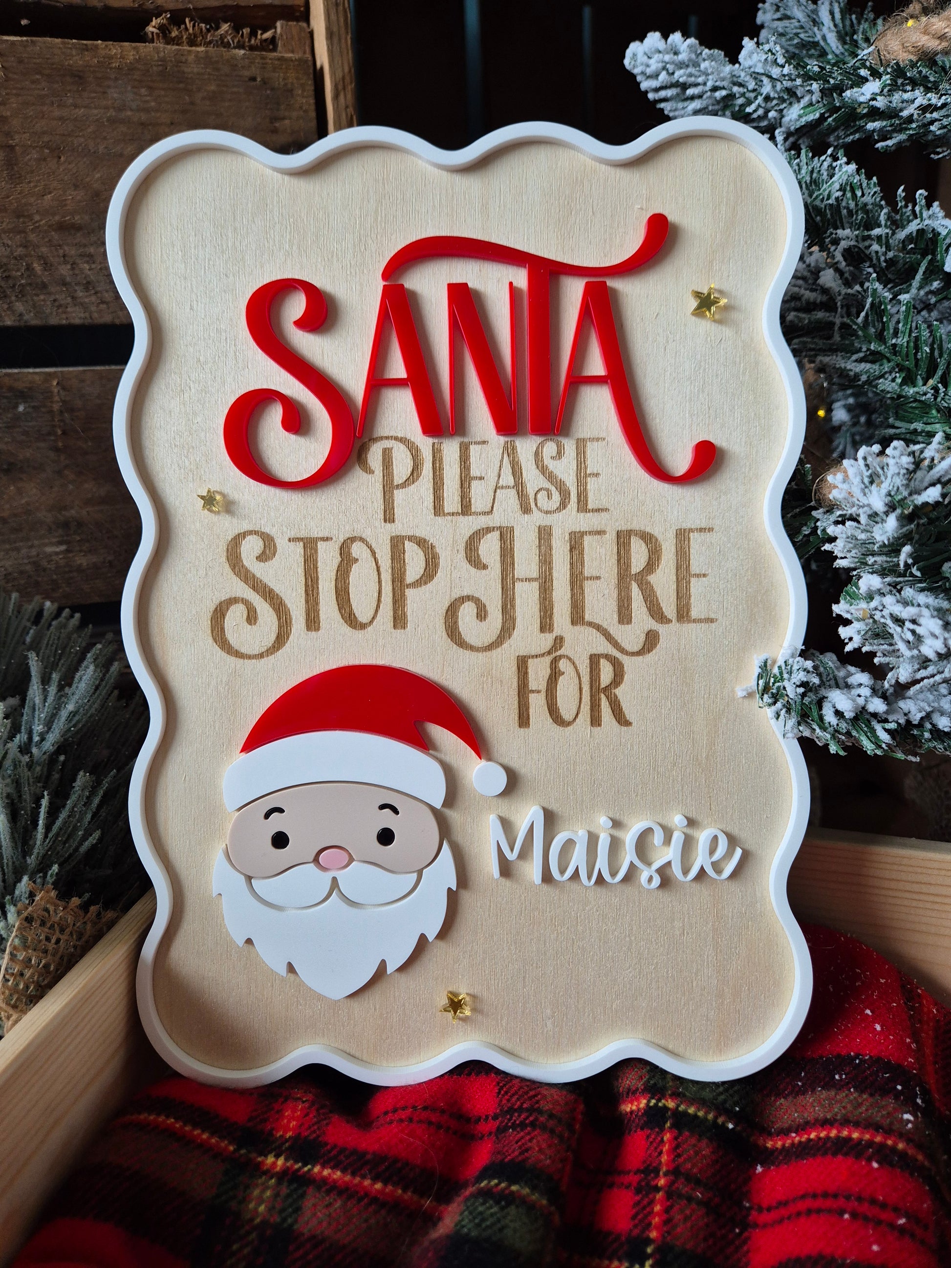 Each piece is crafted from beautiful natural birch plywood, featuring a softly wavy edge of white acrylic, gold mirror acrylic stars, and a retro acrylic Santa for a touch of festive charm. Personalise yours with your child/children's or family name and hang it on their door, or rest on a shelf amongst your Christmas display to let Santa know exactly where to stop!