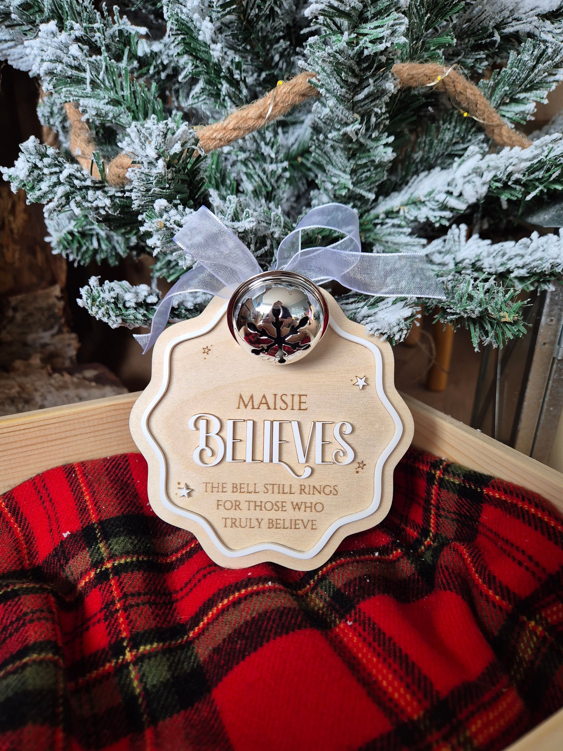- Believe Bell Ornament — silver jingle bell and sheer ribbon keepsake