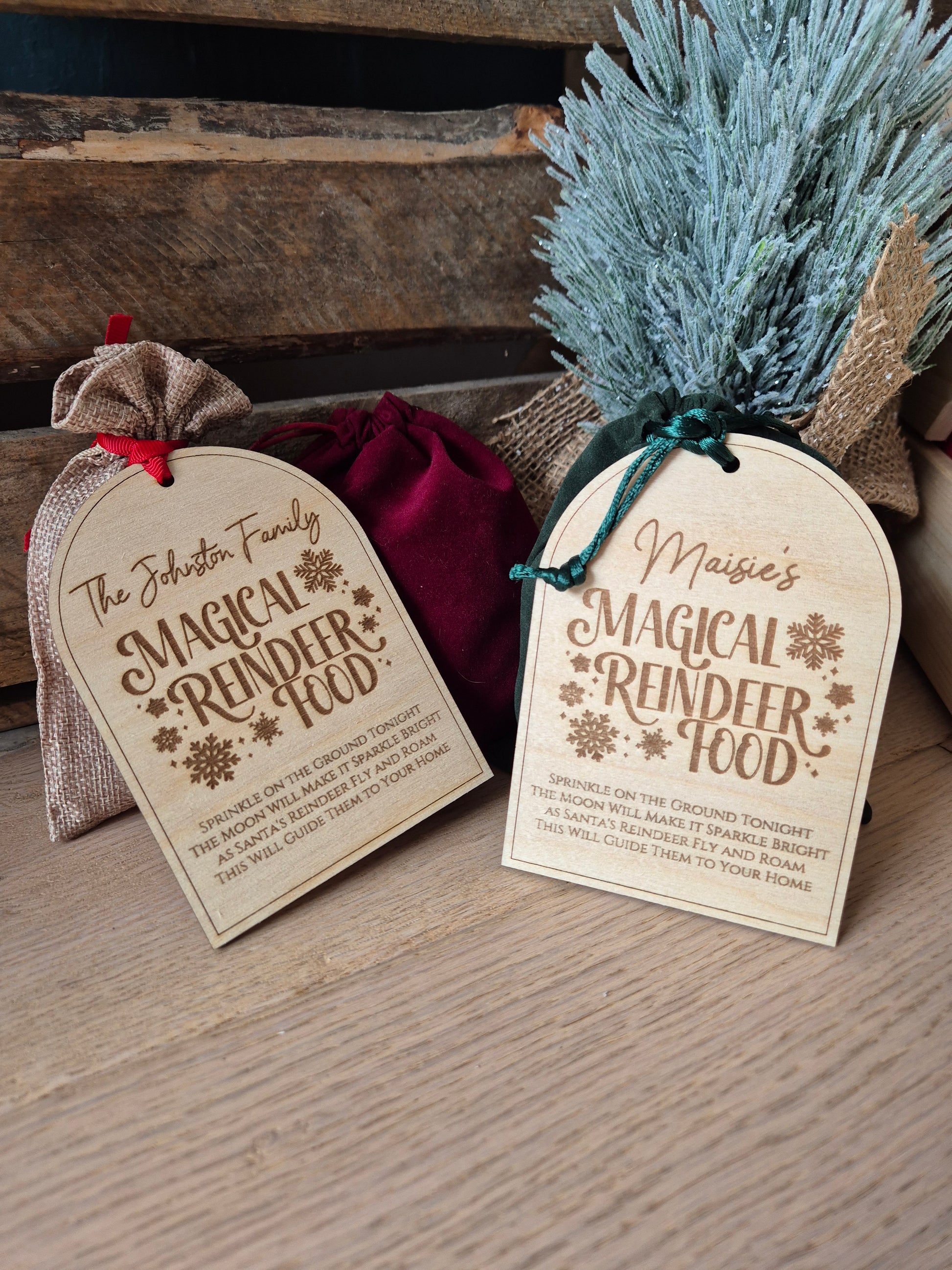 - Reindeer Treat Bag — choice of red, green, or burlap bag filled with eco-friendly oats, finished with a personalised wooden tag