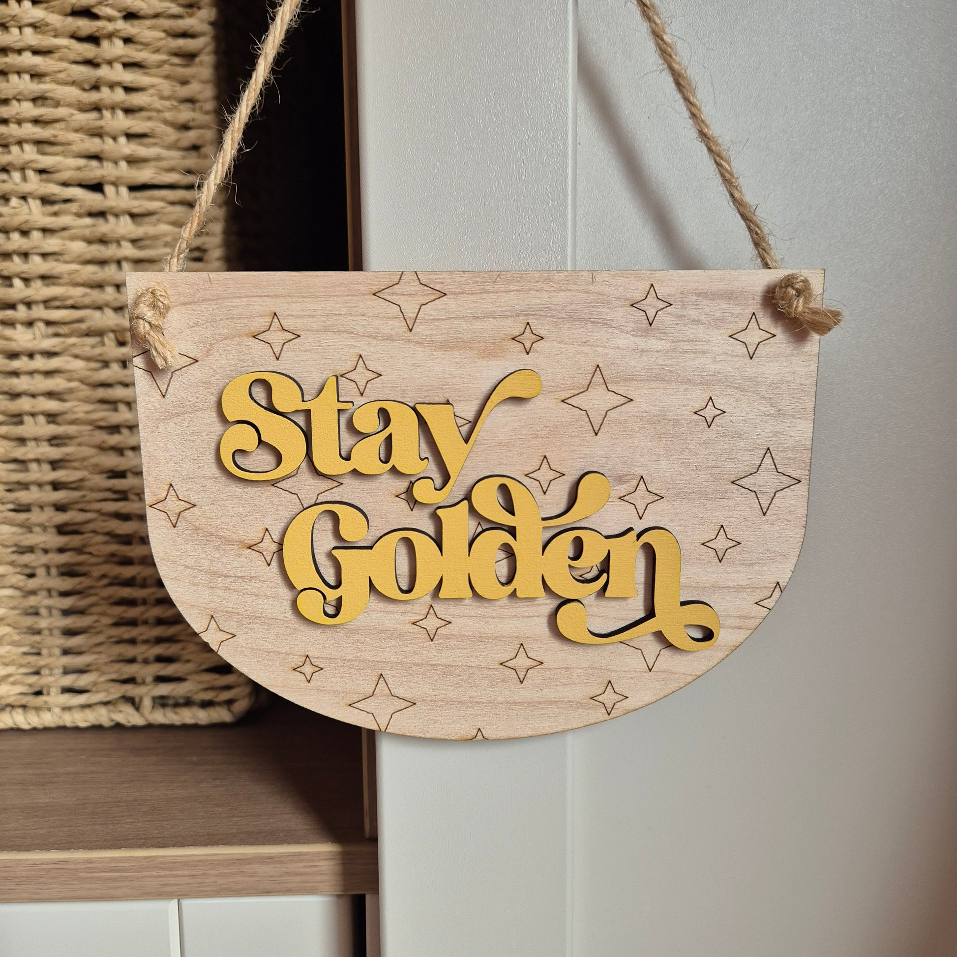 Bring a little retro charm, colour and personality to your child's room, play space or nursery with out handcrafted wooden hanging sign: "Stay Golden".