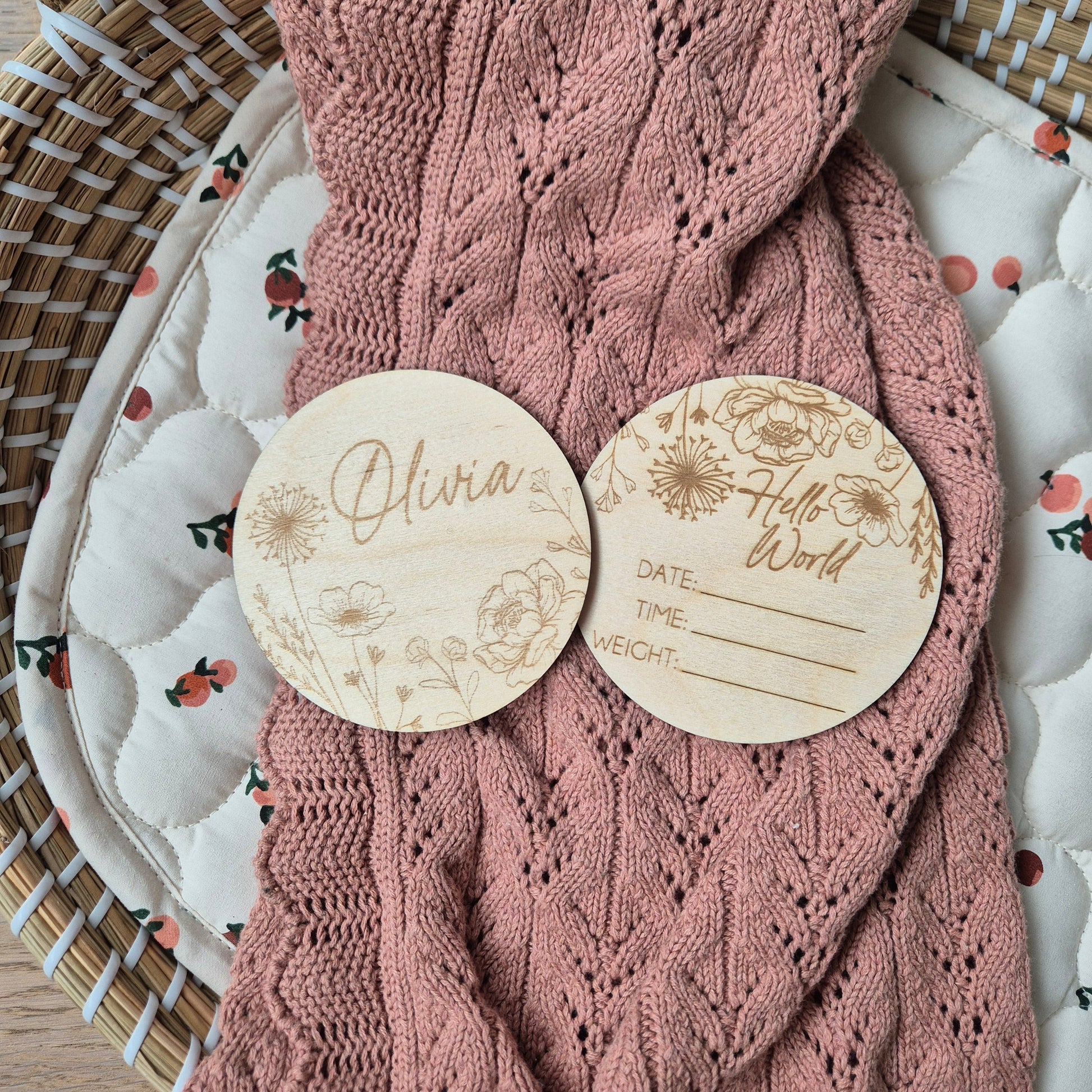 Crafted from high quality and sustainably sourced European birch plywood, and engraved with a delicate floral design, this disc wonderfully complements the rest of the name announcements, milestones and photo props in our Meadow collection.