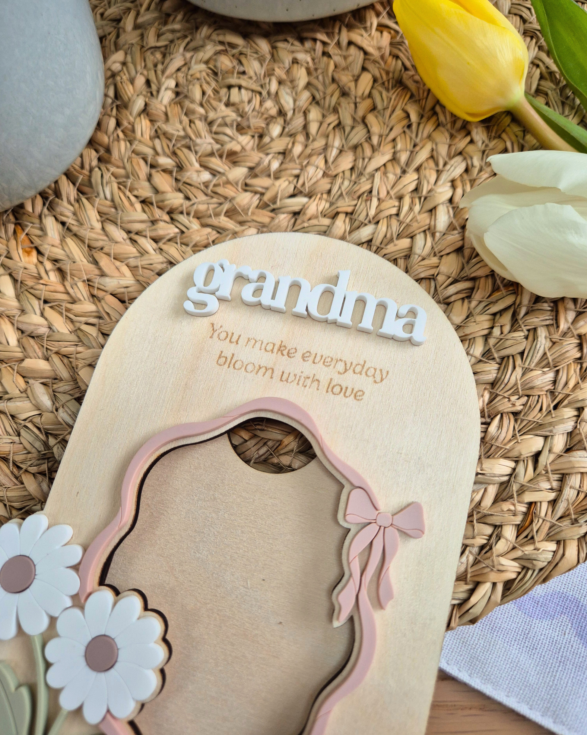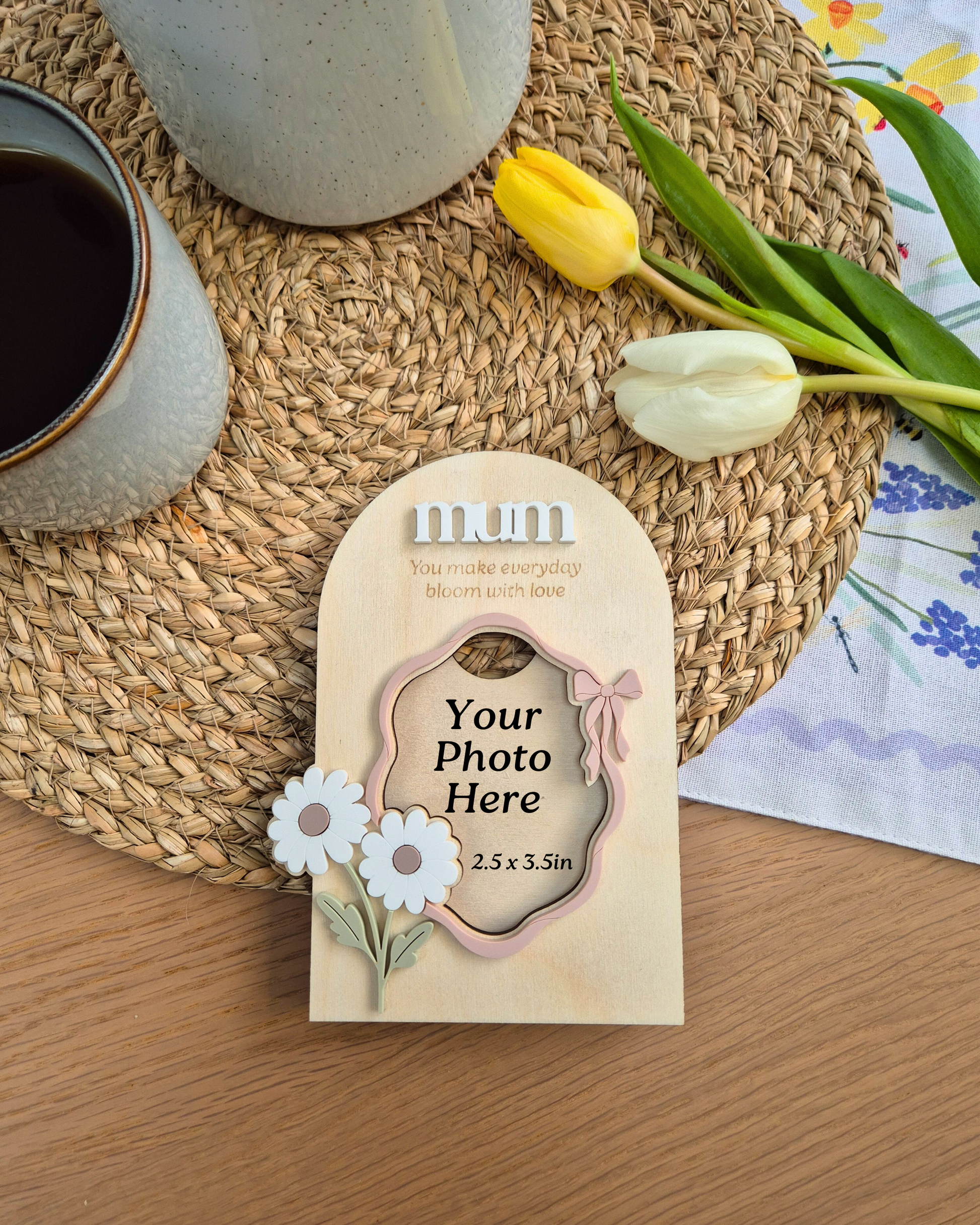 A meaningful and elegant Mother’s Day keepsake designed to hold a favourite photo and a heartfelt message in one beautiful piece. This large, personalised photo magnet features a soft, matt acrylic floral and bow design layered onto sustainably sourced birch plywood, and laser cut into a triple-layer photo frame magnet. A sentimental gift that turns a favourite photo into something she’ll see and smile at every day.