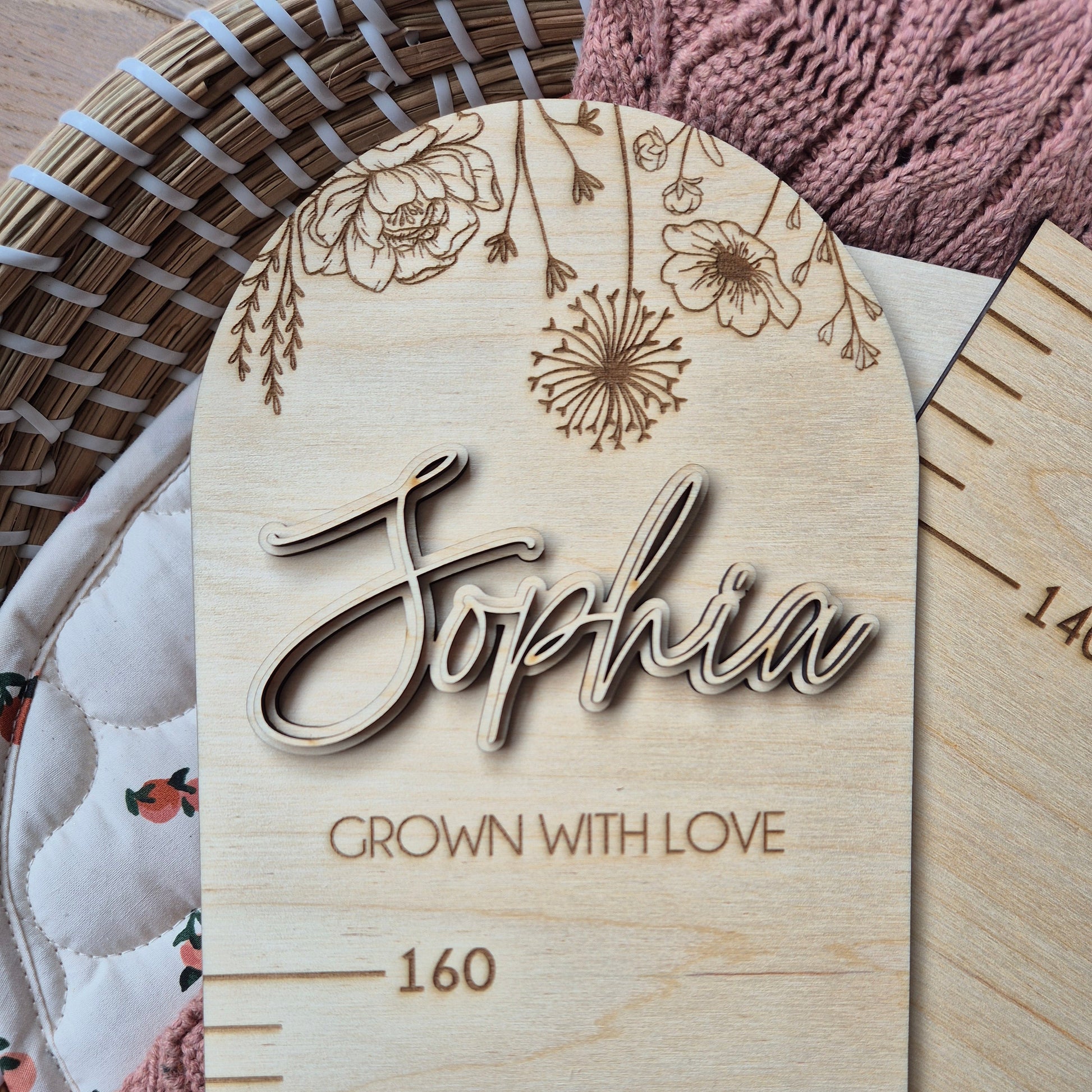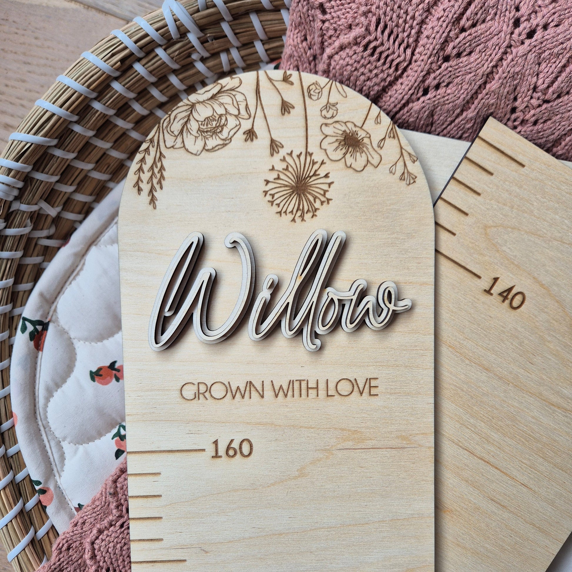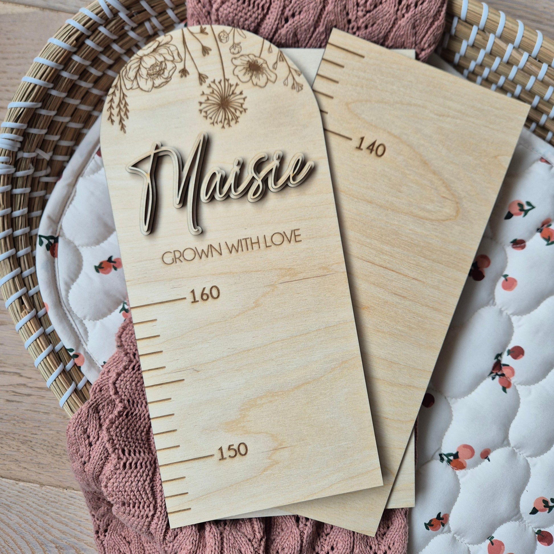 Celebrate every little growth spurt with our Wooden Height Chart, featuring a delicate floral design from our Meadow Collection. Beautifully engraved with the phrase “Grown With Love” and personalised with your child’s or children's names, this keepsake piece makes a stunning addition to any nursery, playroom, or family space.