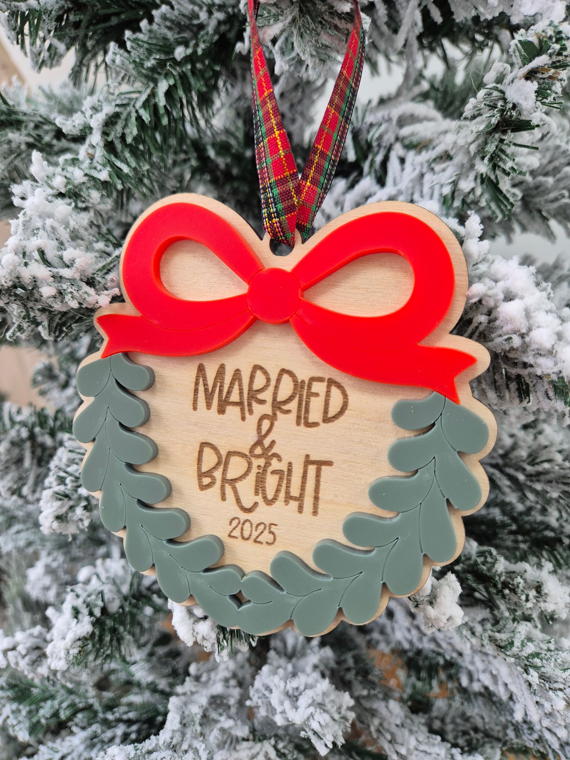 Married and Bright Christmas Hanging Ornament - Personalised Newlyweds Tree Decoration