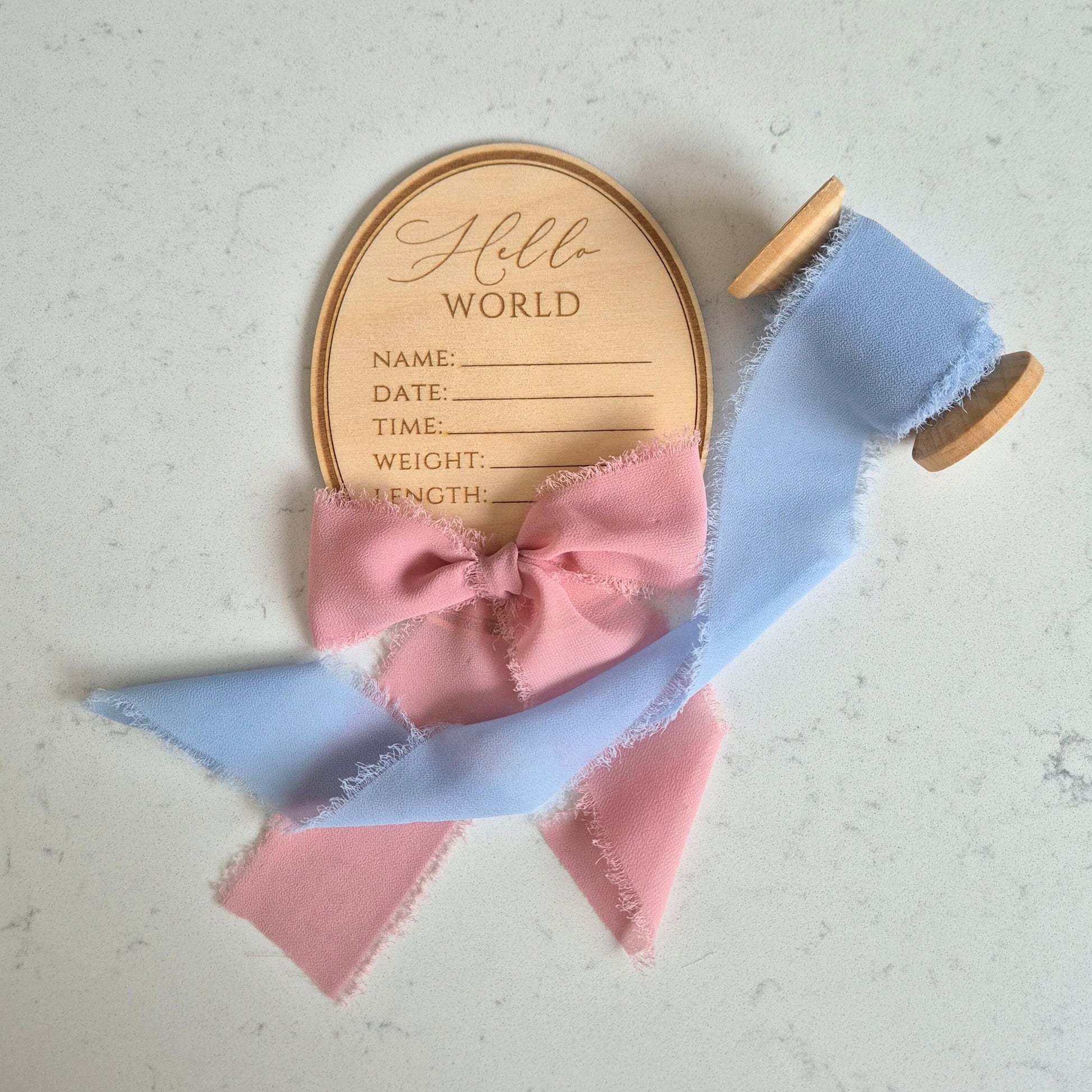 Made from sustainably sourced European birch plywood, and finished with your choice of frayed chiffon ribbon bow in a range of soft, vintage-inspired tones. Choose from neutral ribbon colours such as white or beige for your bows if you will have a surprise (or would like a pre-tied bow!), or choose a combination of two ribbons to tie yourself once your little bundle is here.