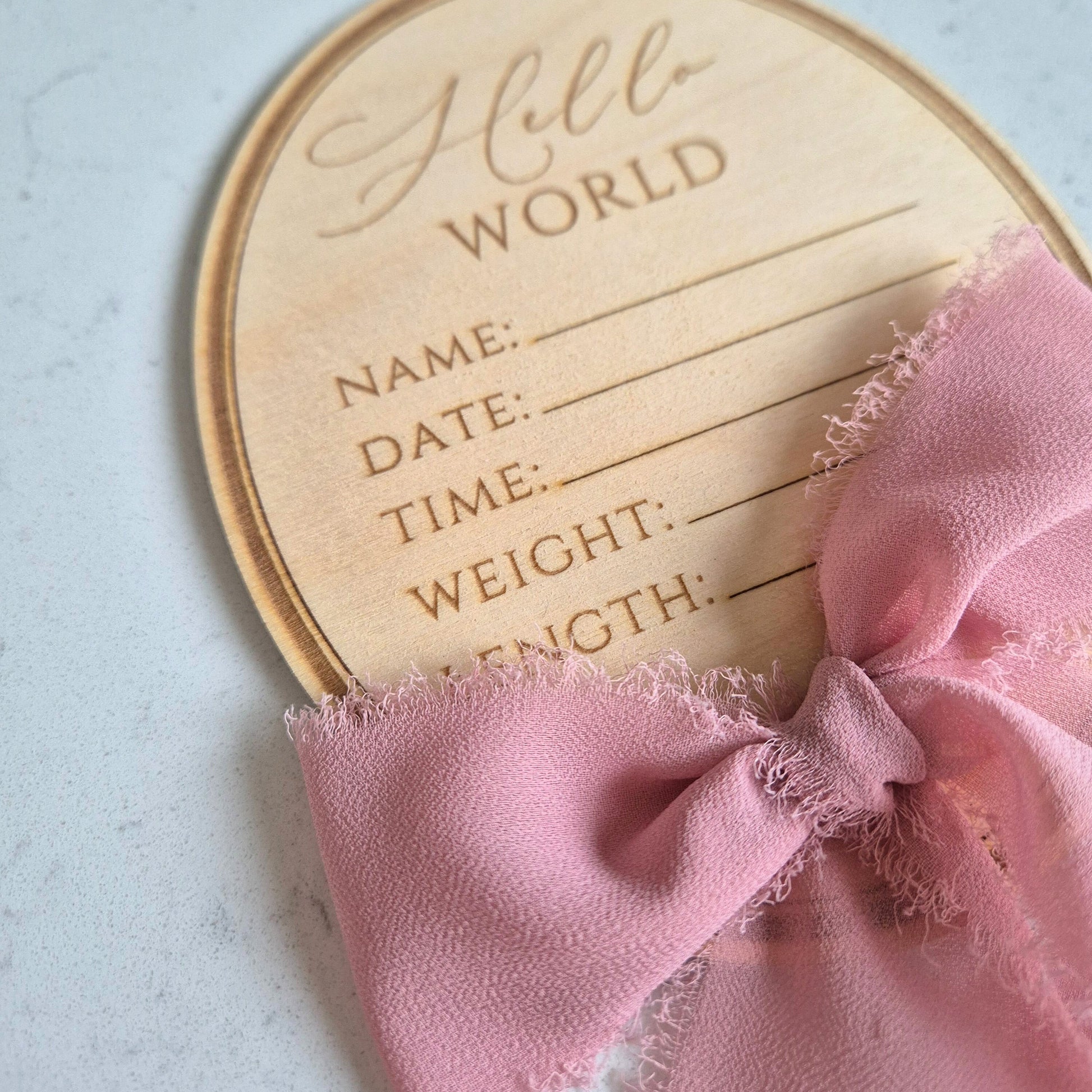 Vintage Oval Baby Birth Stats Announcement Sign - 'Hello World' Plaque with Writable Space